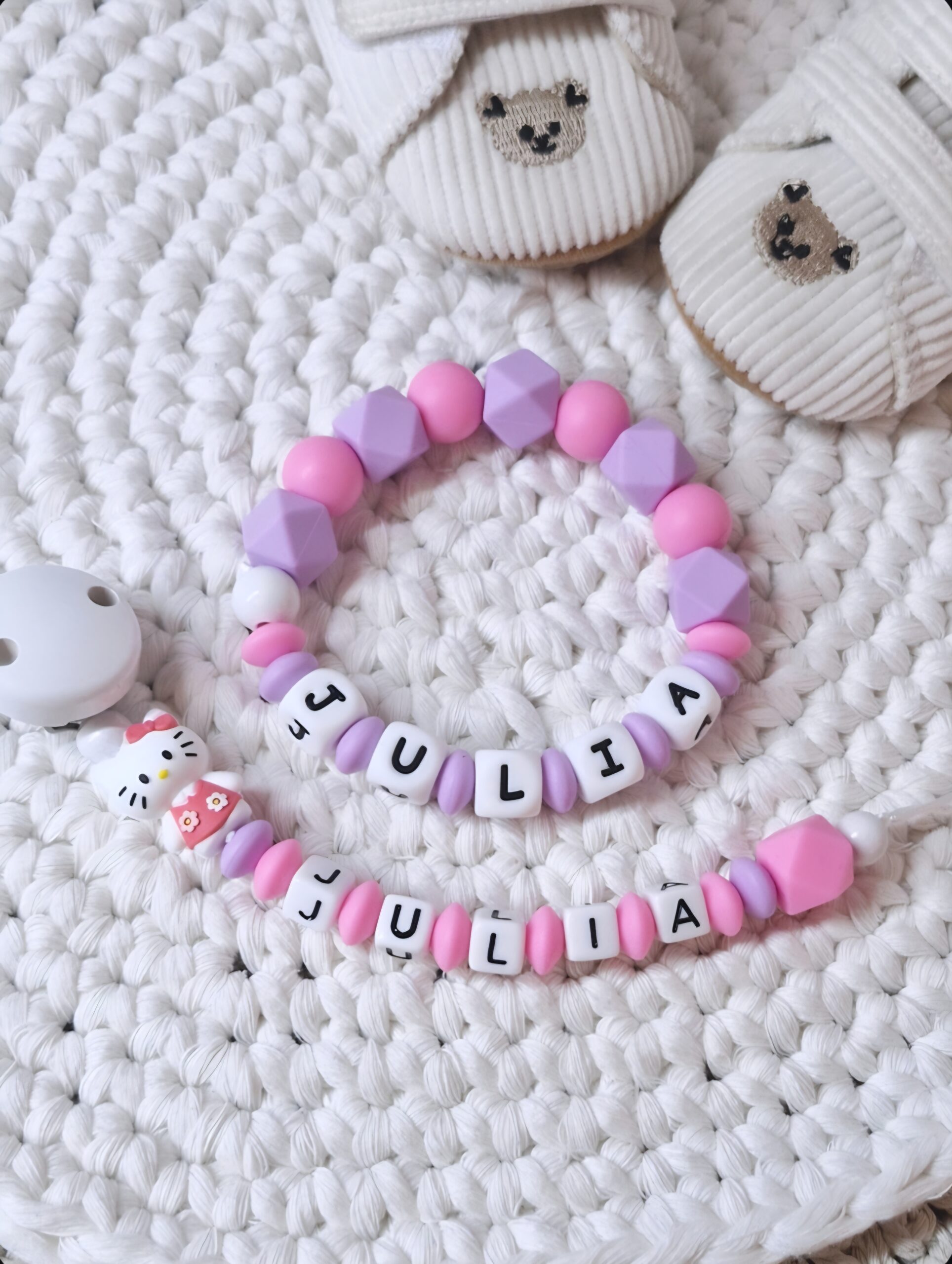 Dieses Set ist dazu gedacht, diese wundervollen, zarten Momente zu begleiten. Unsere personalisierte Schnullerkette und der passende Beißring sind so weich und liebevoll gestaltet, dass sie sofort zum Lieblingsstück werden.✨👶