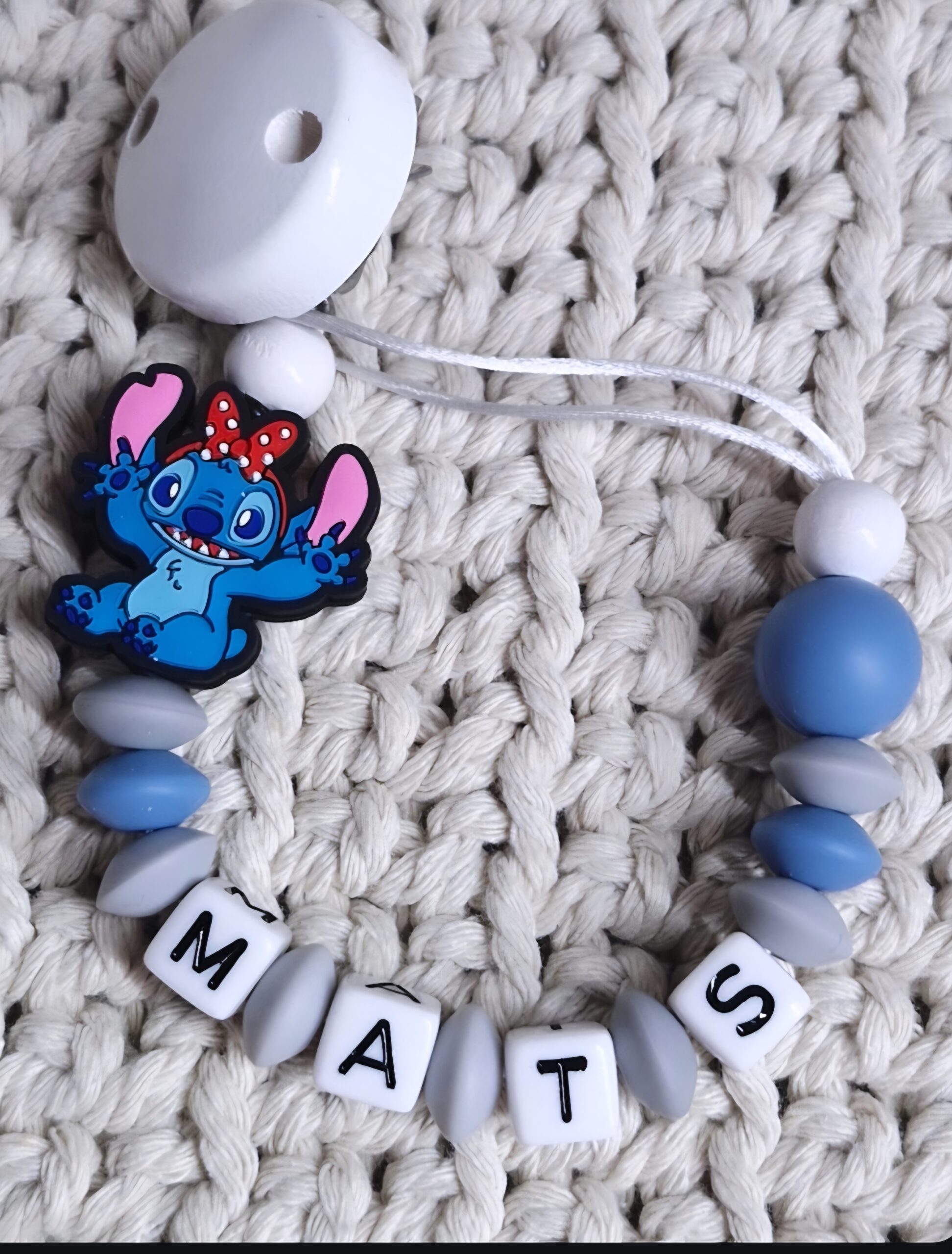 Diese super süße Schnullerkette hält den Schnuller sicher und ist dank des beliebten Stitch-Motivs ein echter Hingucker.